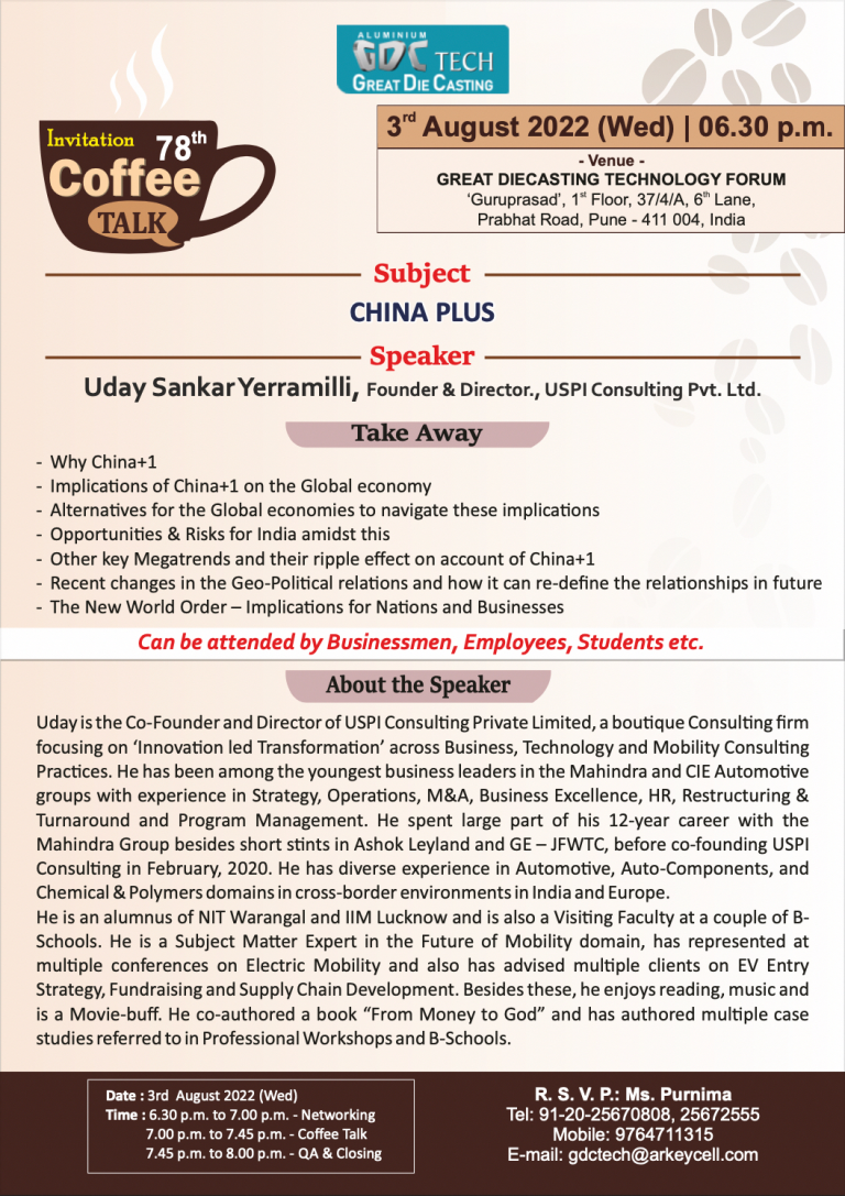 GDCTech Forum, as a part of the 78th edition of its Coffee Talk, has invited our Co-Founder & Director, Uday Sankar Yerramilli to address their members on the topic ‘China Plus’.